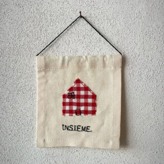 La bandierina misura circa 12 x 13 cm, contiene un sostegno di legno nella parte alta e si appende al muro tramite un filo di cotone di colore nero. Ogni pezzo è unico e può differire leggermente nella misura.