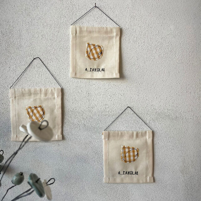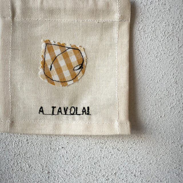 Bandierina in cotone realizzata con tessuti di recupero di colore ecru e applicazione in cotone vichy giallo a forma di cappelletto. Ricamo a macchina con filo nero “A TAVOLA!”.