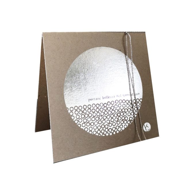 Biglietti di auguri in cartone grigio con scritta e lacciolo argento.